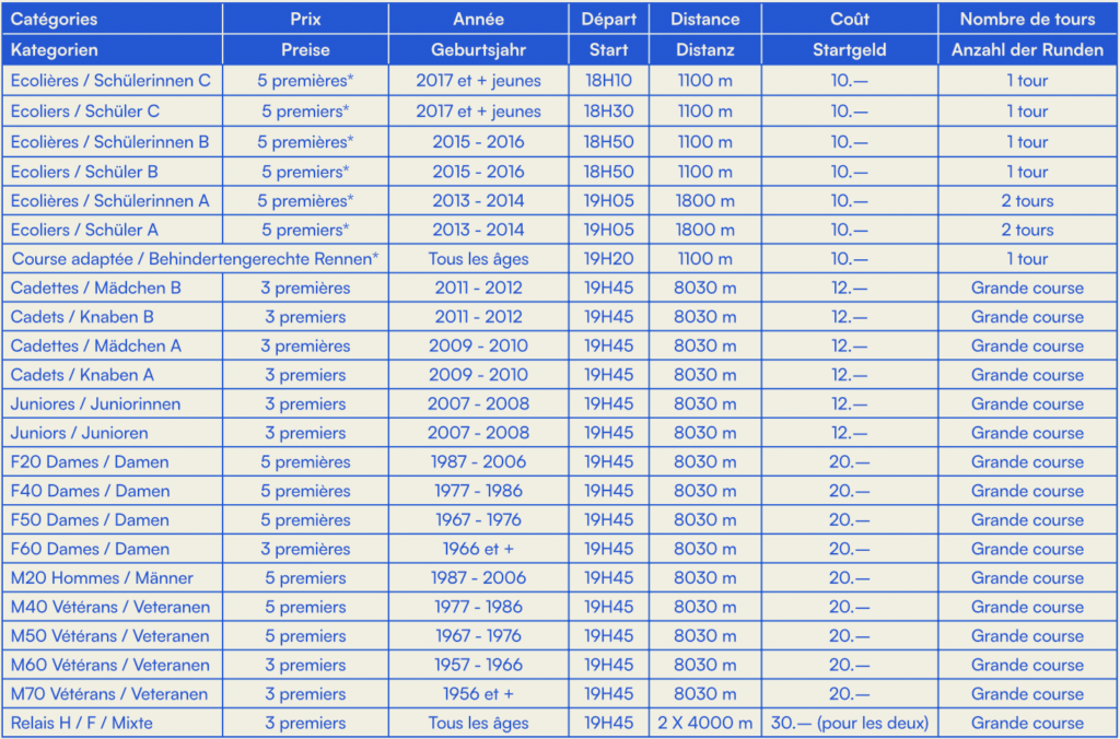 Ci-après, un aperçu des catégories et départs de la course 👀